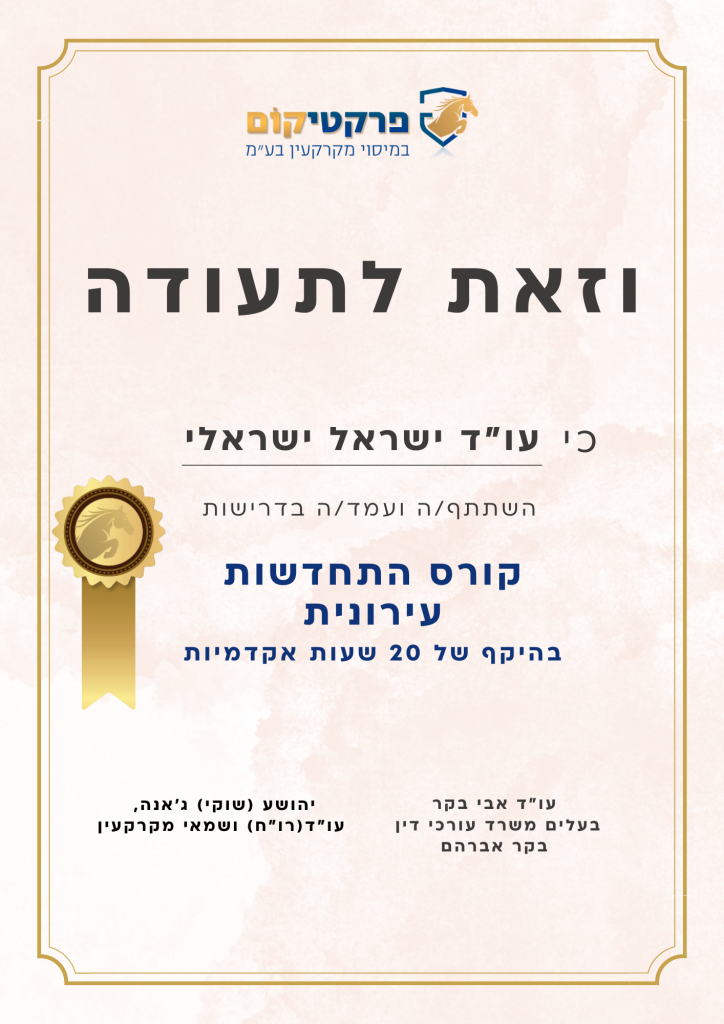 ההתחדשות העירונית היא כבר מזמן לא רק טרנד תכנוני – אלא זירה מקצועית מורכבת ורבת־תחומים שבה נפגשים אינטרסים קנייניים, יזמות עסקית, חזון תכנוני, ושאלות משפטיות ומיסויות כבדות משקל. קורס ייחודי, פרקטי ומקיף יוצא לדרך ומבקש להציע למשתתפיו לא רק ידע תיאורטי – אלא ארגז כלים מעשי ויישומי לעבודה בשטח.